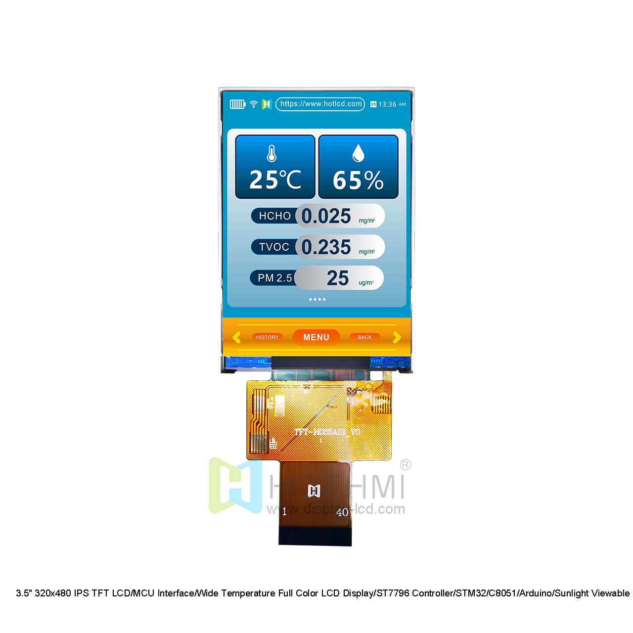 3.5-inch 320x480 IPS TFT LCD/MCU interface/wide temperature full-color LCD display/ST7796 controller/STM32/C8051/Arduino/sunlight viewable TFT-H035A12HVISTKN40This 3.5-inch TFT display has extremely high brightness (1,000 nits), full color and IPS resolution, so you will have a good picture no matter which direction you look at it. It is ideal for a variety of applications. This display can be used in direct sunlight, indoor lighting or dark environments. It can be mounted above, at eye level or below eye level without color inversion.