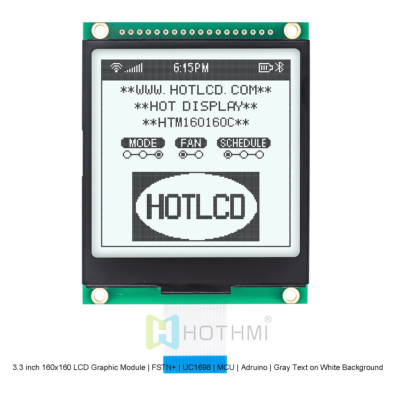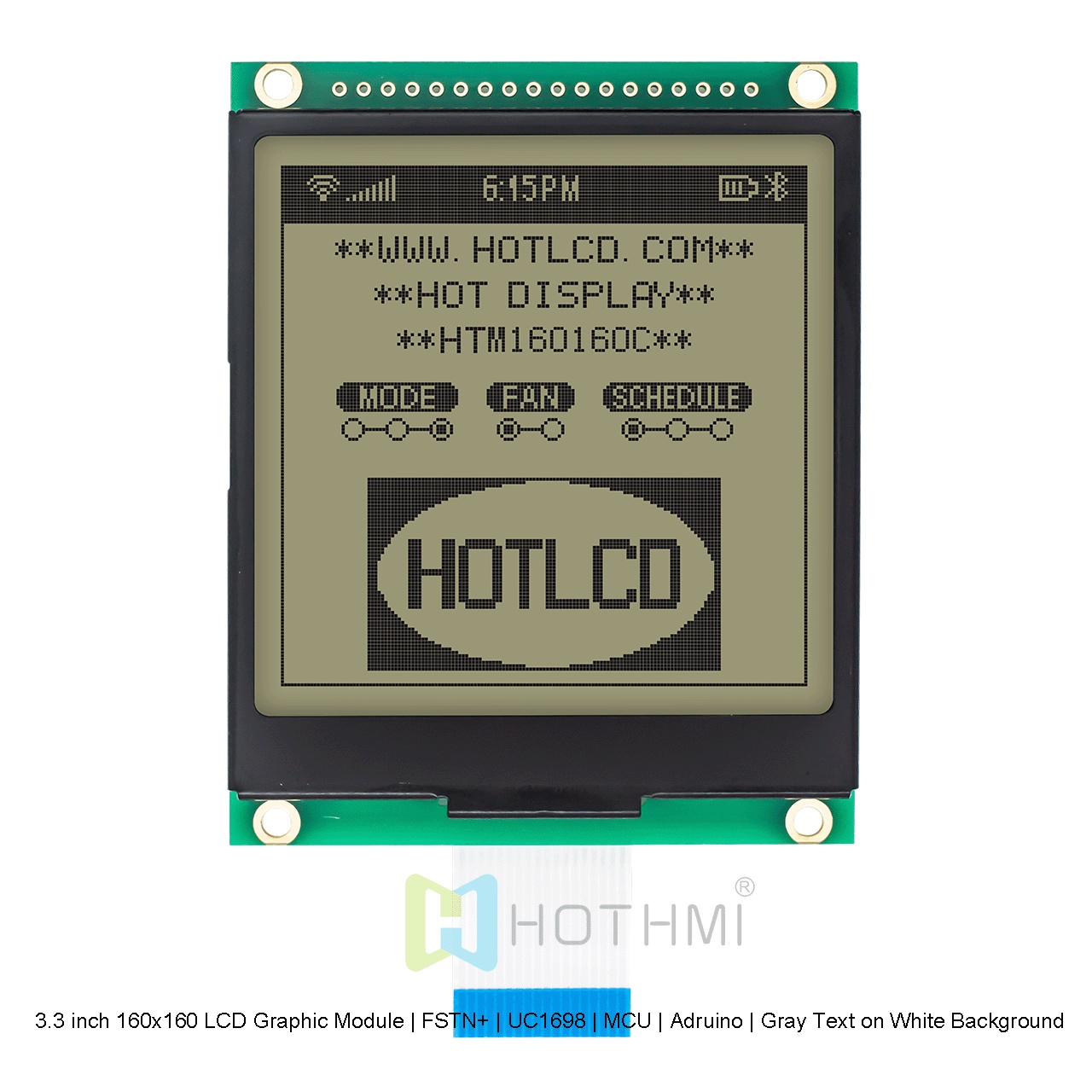 The 3.3 inch 160x160 LCD Graphic Module displays dark pixels on a white background. This transmissive LCD display is designed to provide optimal visibility and impressive colors when used in darker environments. The display has a strong built-in backlight to provide high contrast and ensure readability of all graphics on the screen.