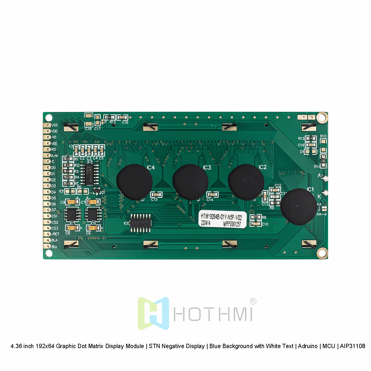 The 4.36 inch 192x64 Graphic Dot Matrix Display Module displays white pixels on a blue background. This fully transparent LCD display is carefully designed, and the LCD has a strong built-in backlight to provide high contrast and display clear graphics to the viewer. This advanced display technology ensures that the display is always easy to read regardless of the lighting conditions.