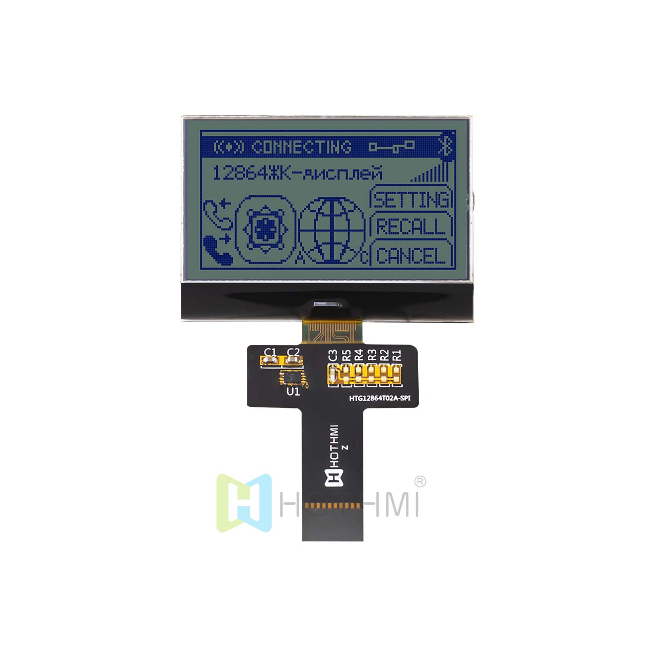 This 2.2" HOT Display 128x64 Graphic Chip on Glass (COG) LCD module displays blue pixels on a gray background. This transmissive LCD display is engineered to reflect the image to the viewer in ambient light through the reflection of the polarizer and to provide optimal visibility and impressive colors when used in darker environments through the backlight. The display has a powerful built-in backlight to provide high contrast and ensure readability of all graphics on the screen.