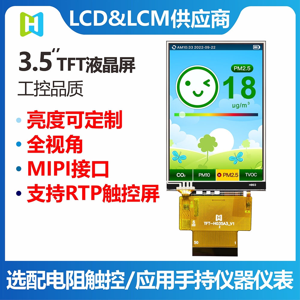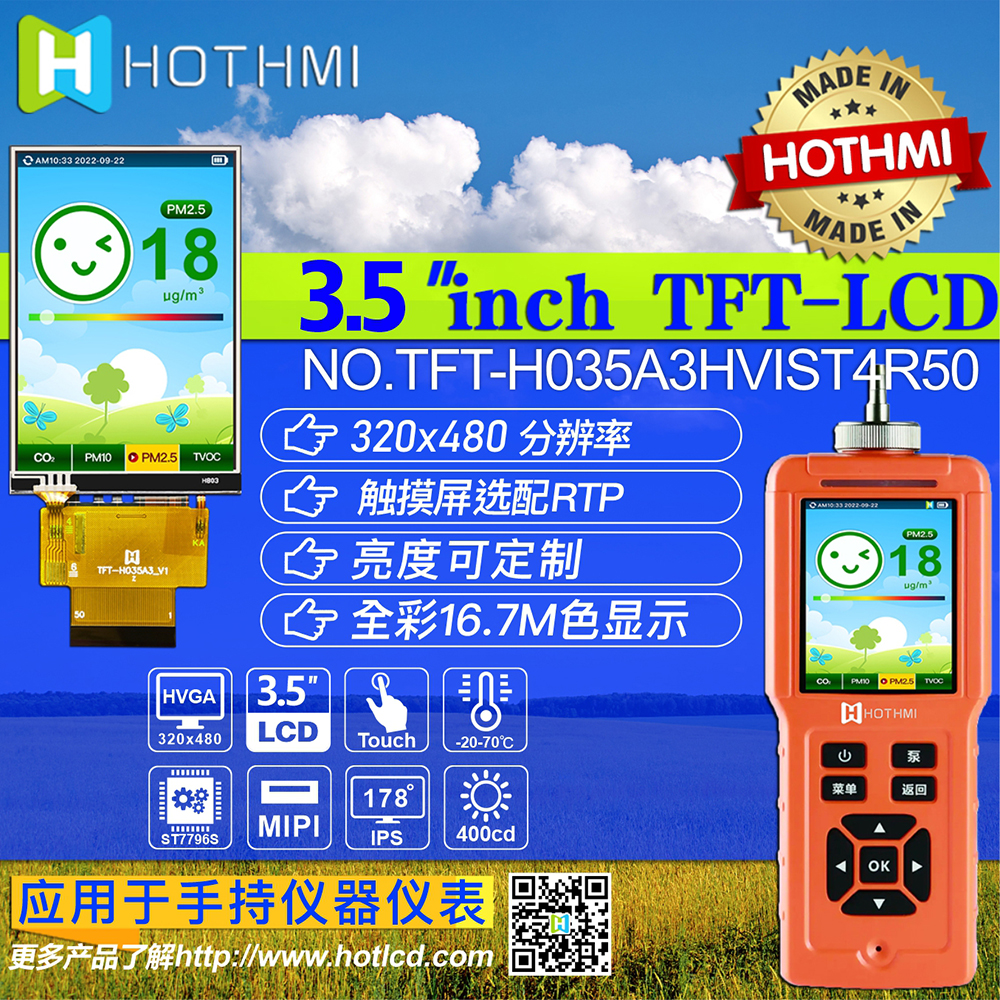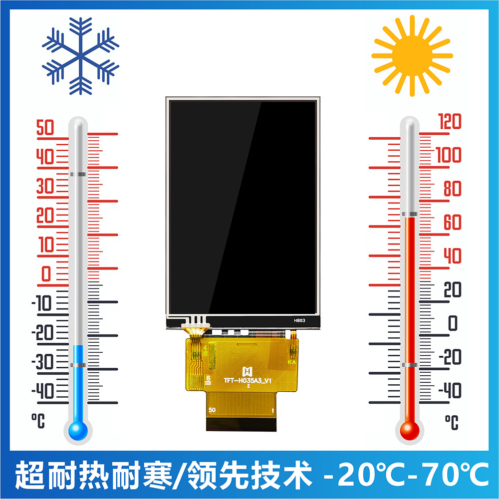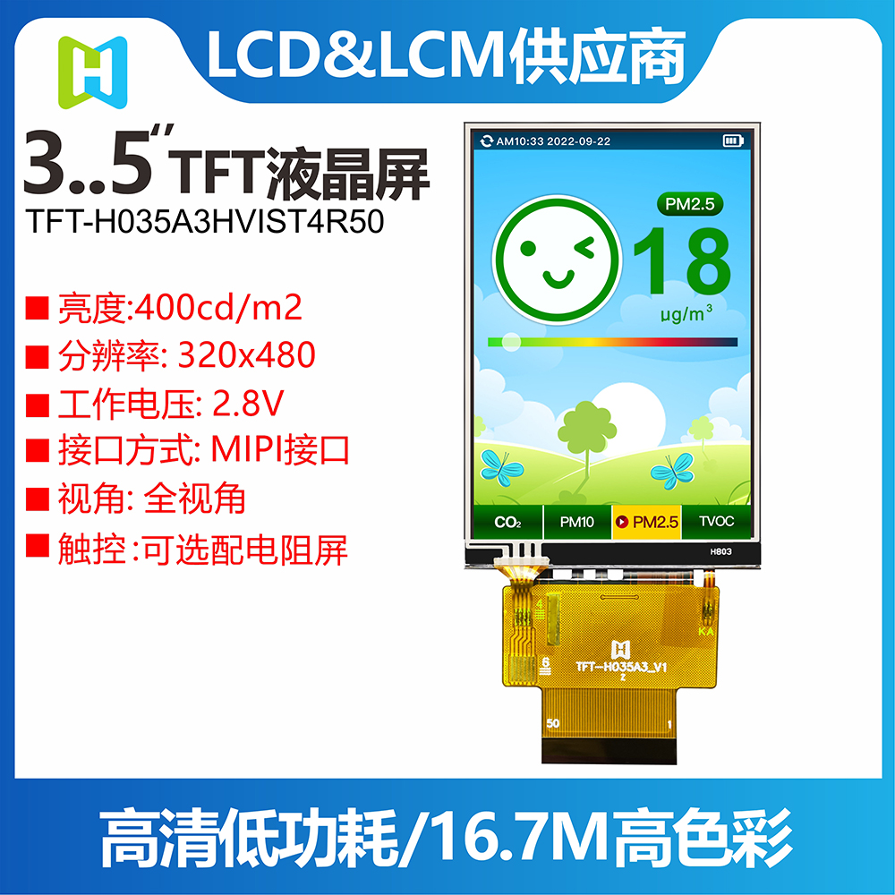 Product Description The TFT-H035A3HVIST4R50 is a 3.5-inch wide temperature IPS TFT-LCD monitor with a projected resistive touch screen with a resolution of 320X480 pixels. The module has built-in ST7796S driver IC, which supports MIPI fully compatible interface. TFT-H035A3HVIST4R50 adopts IPS panel, which has the advantage of wider viewing angle, left: 80/right: 80/up: 80/down: 80 degrees (typical value), contrast ratio 800:1 (typical value), brightness 400 nits (typical value) value), glare panel, 1:1.5 aspect ratio. Support I2C interface and single touch function. The H035A3H model has a projected resistive touch panel (PCAP), and the TFT-H035A3HVIST4R50's supply voltage (VCC) is 2.5V to 3.0V, typically 2.8V. It can operate at temperatures from -20°C to +70°C and storage temperatures from -30°C to +80°C.