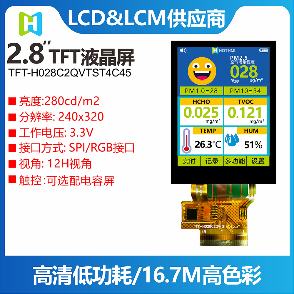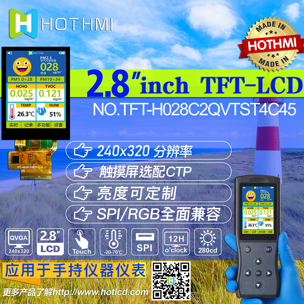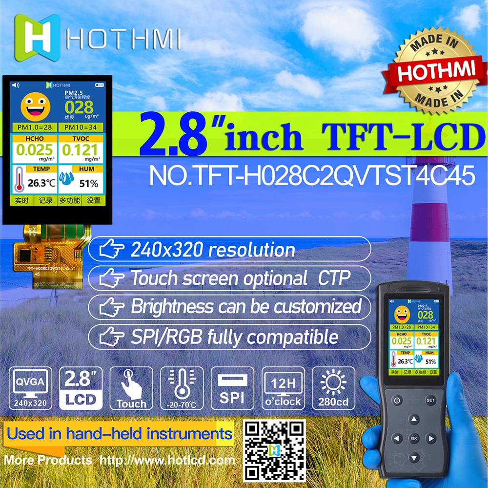 The TFT-H028C2QVTST2C45 is a 2.8-inch wide temperature IPS TFT-LCD display with projected capacitive touchscreen with a resolution of 240x320 pixels. The module has built-in ST7789V driver IC and supports SPI/RGB/MCU fully compatible interface. TFT-H028C2QVTST2C45 adopts IPS panel, which has the advantage of wider viewing angle, left: 80 / right: 80 / top: 80 / bottom: 80 degrees (typ.), contrast ratio 800:1 (typ.), brightness 280 nits (typ. value), glare panel, 16:9 aspect ratio. The touch screen has built-in FT6336U IC, which supports I2C interface and multi-touch function. The H028C2Q model has a projected capacitive touch panel (PCAP) but no touch panel option (TFT-H028C2QVTST3N45). The supply voltage (VCC) of the TFT-H028C2QVTST2C45 is 3.0V to 3.6V, with a typical value of 3.3V. It can work at temperatures from -20°C to +70°C and storage temperatures from -30°C to +80°C. 2.8 inch TFT color screen /240*320 resolution /12H White LED /RGB/SPI/MCU interface /TFT-H028C2QVTST2C45/used in handheld instruments