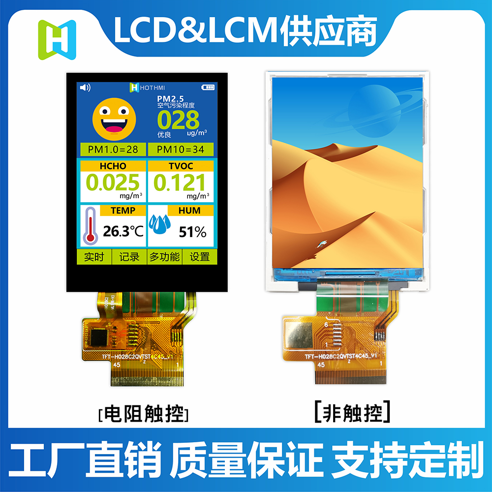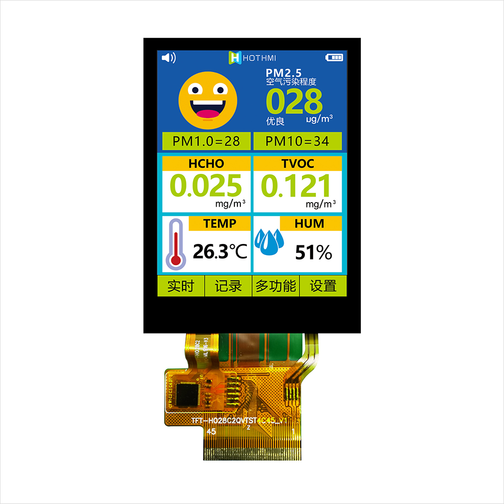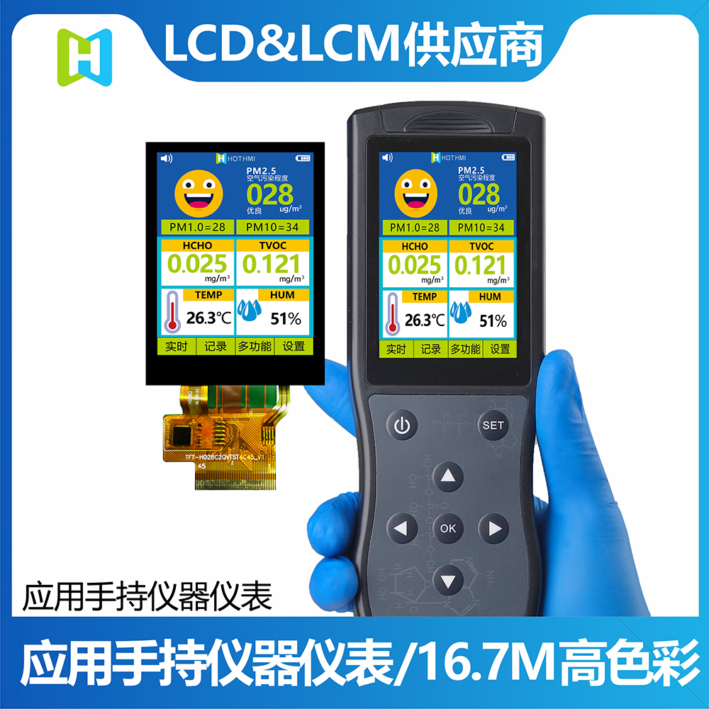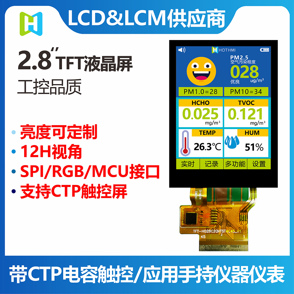 The TFT-H028C2QVTST2C45 is a 2.8-inch wide temperature IPS TFT-LCD display with projected capacitive touchscreen with a resolution of 240x320 pixels. The module has built-in ST7789V driver IC and supports SPI/RGB/MCU fully compatible interface. TFT-H028C2QVTST2C45 adopts IPS panel, which has the advantage of wider viewing angle, left: 80 / right: 80 / top: 80 / bottom: 80 degrees (typ.), contrast ratio 800:1 (typ.), brightness 280 nits (typ. value), glare panel, 16:9 aspect ratio. The touch screen has built-in FT6336U IC, which supports I2C interface and multi-touch function. The H028C2Q model has a projected capacitive touch panel (PCAP) but no touch panel option (TFT-H028C2QVTST3N45). The supply voltage (VCC) of the TFT-H028C2QVTST2C45 is 3.0V to 3.6V, with a typical value of 3.3V. It can work at temperatures from -20°C to +70°C and storage temperatures from -30°C to +80°C. 2.8 inch TFT color screen /240*320 resolution /12H White LED /RGB/SPI/MCU interface /TFT-H028C2QVTST2C45/used in handheld instruments