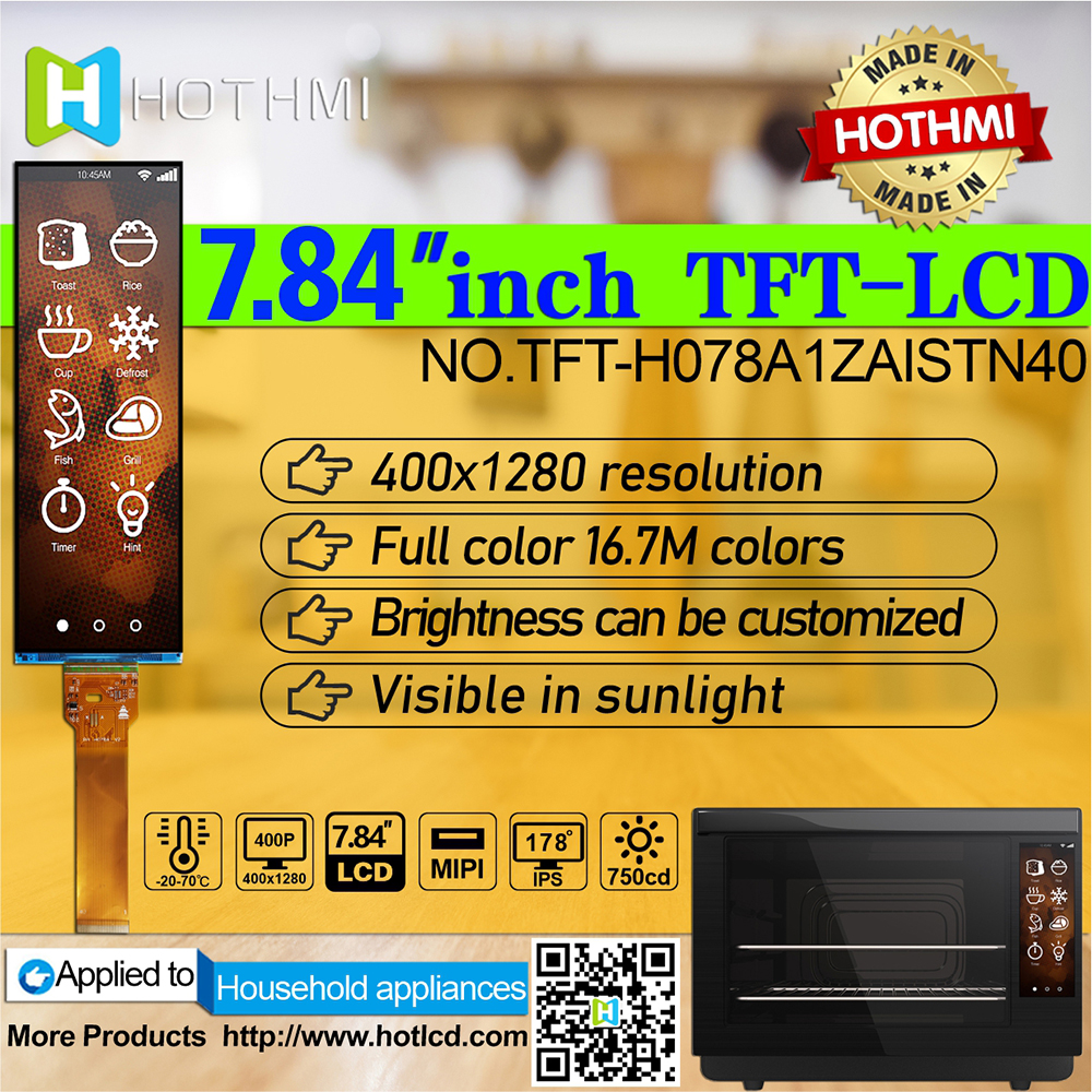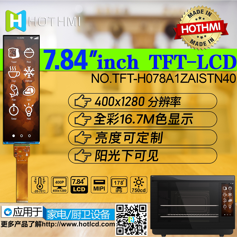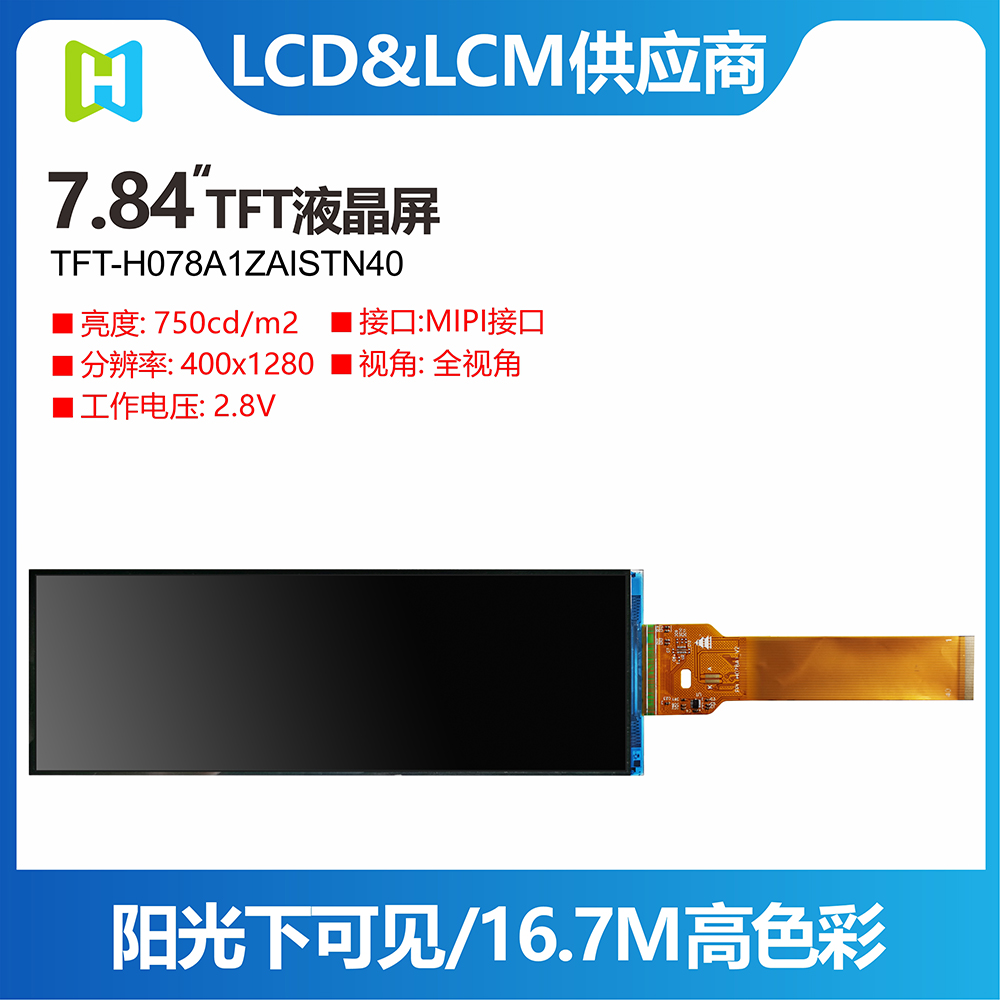 TFT-H078A1ZAISTN40 is a 7.84-inch TFT LCD module with IPS panel technology. This TFT-LCD has a resolution of 400 x 1280 pixels. The TFT-H078A1ZAISTN40 module has built-in ST7703 driver IC, supports MIPI interface, the contrast ratio is 700 (typical value), and the module brightness is 700 nits (typical value). H078A1 adopts IPS panel technology, the viewing angle is wider than TN glass, the left: 80 / right: 80 / top: 80 / bottom: 80 degrees, the color is vivid, and the high-quality picture is saturated and natural. The driving voltage of the H078A1 module is 3.3V, normal black/transmissive LCD, matte glass. The operating temperature of this module is -20°C to +70°C, and the storage temperature is -30°C to +80°C. If the customer's product application needs to use high-brightness TFT, the TFT-H078A1ZAISTN40 module can be selected, and its module brightness is 700 nits (typ.).