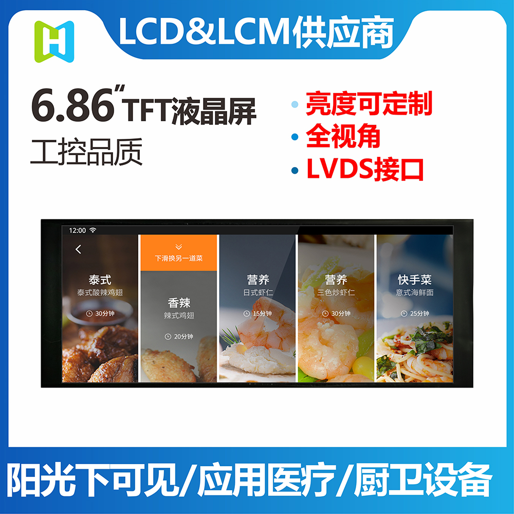 TFT-H068A1ZAINVKN40 is a 6.86-inch TFT LCD module with IPS panel technology. The resolution of this TFT-LCD is 480x1280 pixels. TFT-H068A1ZAINVKN40 module has built-in NV3051F1 driver IC, supports LVDS interface, contrast ratio is 300 (typical value), and module brightness is 1000 nits (typical value). The H068A1 uses IPS panel technology with wider viewing angles than TN glass. Left: 80 / Right: 80 / Top: 80 / Bottom: 80 degrees, vivid colors, high quality picture with saturation and naturalness. The driving voltage of the H068A1 module is 3.3V, ordinary black/translucent liquid crystal, frosted glass, and the screen aspect ratio is 16:9. The module has an operating temperature of -20°C to +70°C and a storage temperature of -20°C to +70°C.