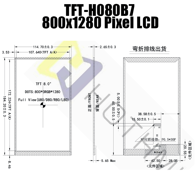Introducing the TFT-H080B7HDINV6N30 a 8.0 inch IPS LCD display that boasts a high resolution of 800x1280 pixels, delivering stunning visuals with vivid colors and crisp details. With its advanced technology, this display is also designed to be sunlight readable, ensuring optimal visibility even in bright outdoor environments.