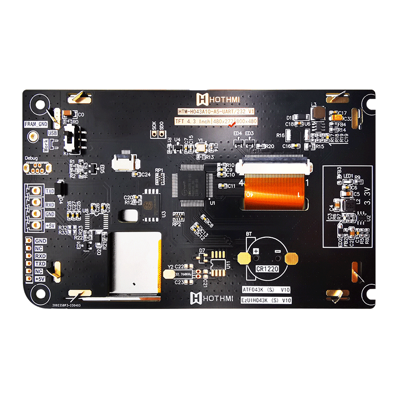 The HTM-H043A2-A5-UART is easy to integrate into your project with its simple UART interface. The LCD controller board handles all the display driving functions, allowing you to focus on your application's core functionality. With its compact size and low power consumption, this TFT module is a great choice for portable devices that require a high-quality display.