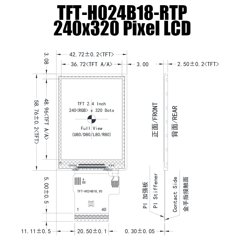 TFT-H024B18QVISTKN40 | 2.4" IPS TFT LCD Display | TFT LCD Display Manufacturer | 240x320 resolution | -30℃~80℃ | FOR INDUSTRIAL CONTROL | Interface 8Bit/16Bit MCU | Wide Temperature | IC ST7789V | Sunlight Readable | Resistive Touch Panel