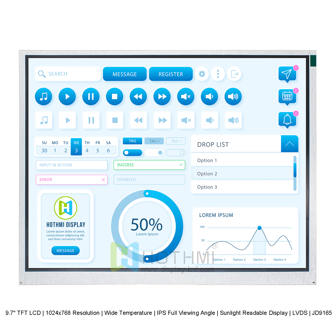 This 9.7" TFT LCD has a resolution of 1024x768 and is equipped with a powerful backlight with a brightness of 500 cd/m2, providing visibility in bright lighting conditions, including direct sunlight. The LCD is RoHS compliant and compatible with Arduino and other similar boards. Some industries and applications include industrial, commercial, control, PLC, outdoor handheld devices, aviation, consumer electronics, medical devices, automotive dashboards, kiosks, field engineering, agriculture, outdoor sports equipment, and many more. The controller optimizes the display's functionality, ensuring smooth operation and accurate rendering of images and graphics.