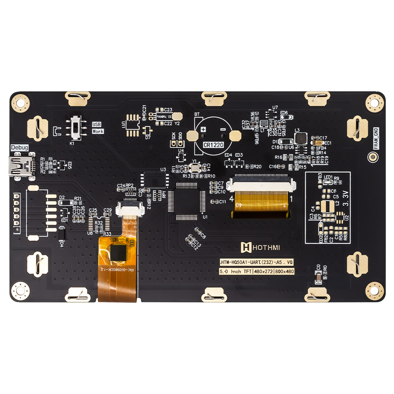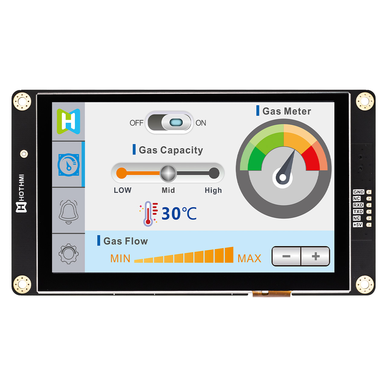 HTM-H050A1-UART-A5C is a 5.0-inch IPS TFT display module with a resolution of 800x480 pixels. It is a display with intelligent display function, UART interface, and human-machine information exchange function. In addition to the controller, our HMI display also integrates MCU function. The MCU receives commands sent by the main control board (client) through the UART interface, and then displays text, images or animations according to these predefined instructions. The MCU on the main control board (client) does not require complex programming or execution specifically for image display. You can easily create text, images or animations using our GUI design software - UI Editor. No programming skills are required. This model is also configured with capacitive touch, multi-touch, smooth and unobstructed.