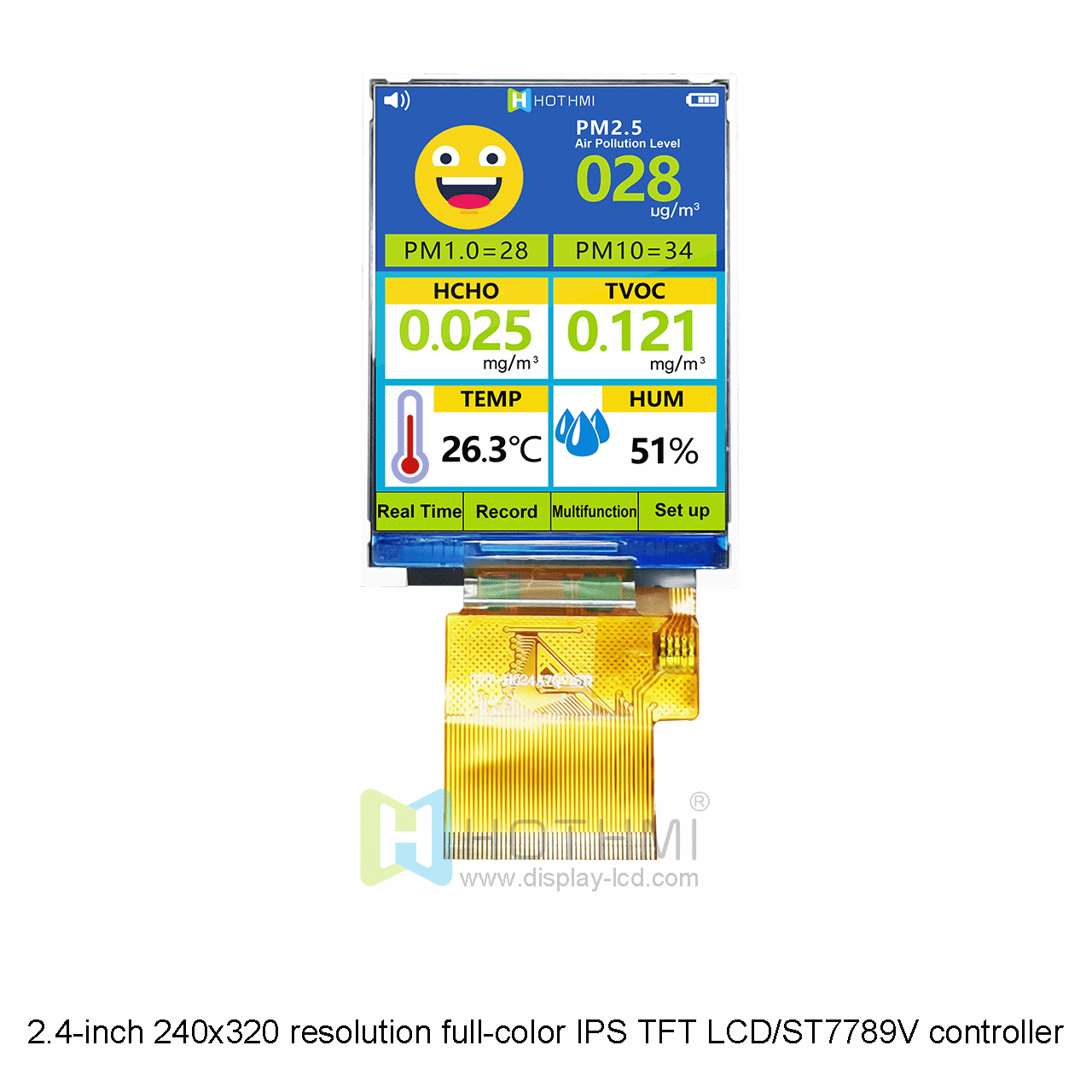 This standard 2.4-inch 240x320 resolution full-color TFT LCD/IPS full-viewing angle high brightness display/ST7789V controller TFT-H024A7QVIST8N45 has a 240x320 pixel resolution, full-viewing angle display, and a standard brightness LED backlight of 800 nits. This transmissive LCD is compact and uses a 2.8 low-voltage power supply, making this display ideal for handheld devices,