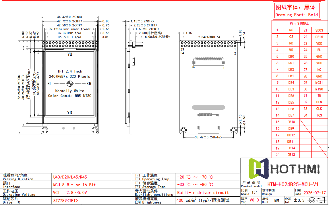 2.4 Inch Resistive Touchscreen TFT LCD Module With MCU Interface HTM-H024B25-MCU-V1 TFT Module 240x320 44.42x72.26x13.5 2.4 2.4 36.72x48.96 IPS 400cd/m2 MCU Anti-static ESD 8KV -20~70℃ +3.3V ST7789