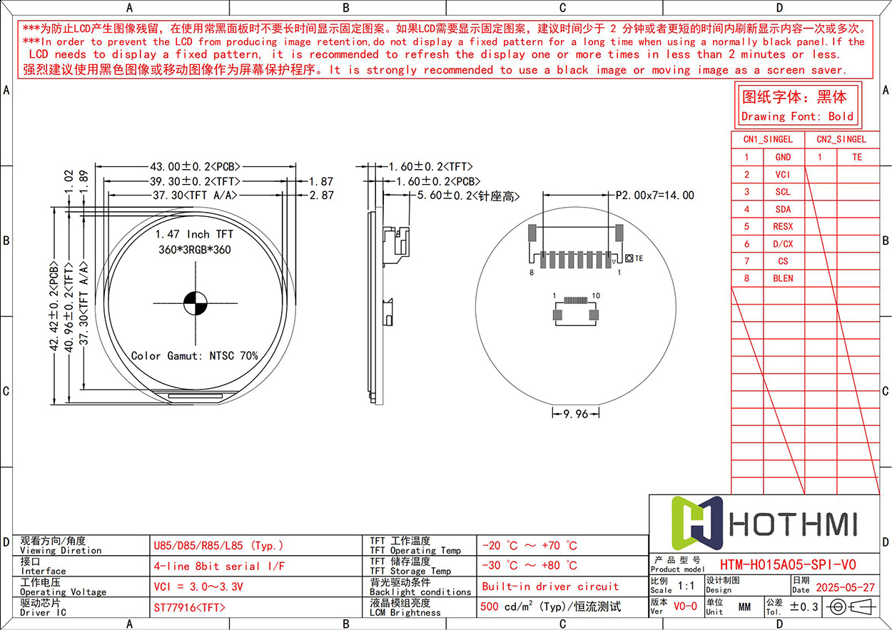| 1.5 inch round TFT Modules with ST77916 Controller HTM-H015A05-SPI-V0 | TFT Module | 360x360 |