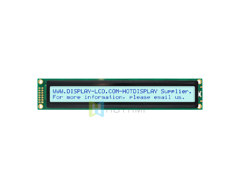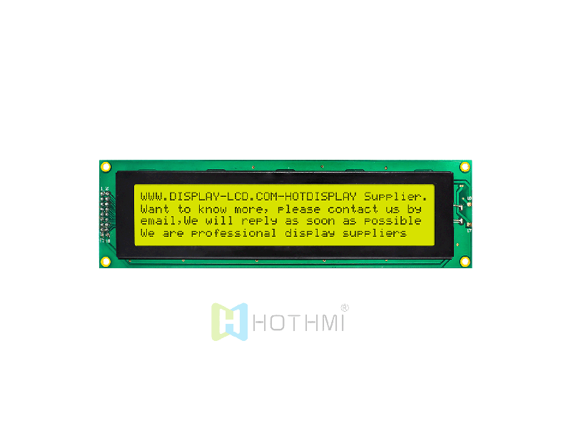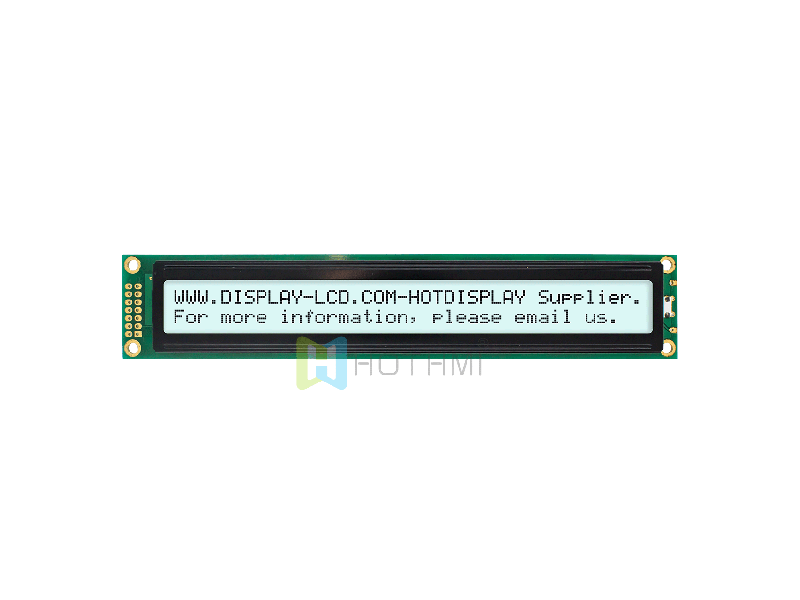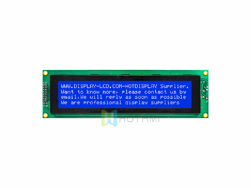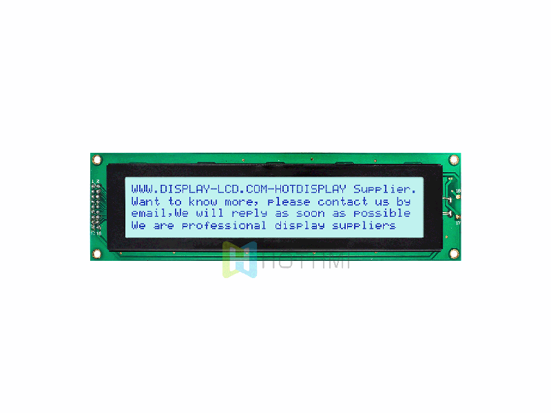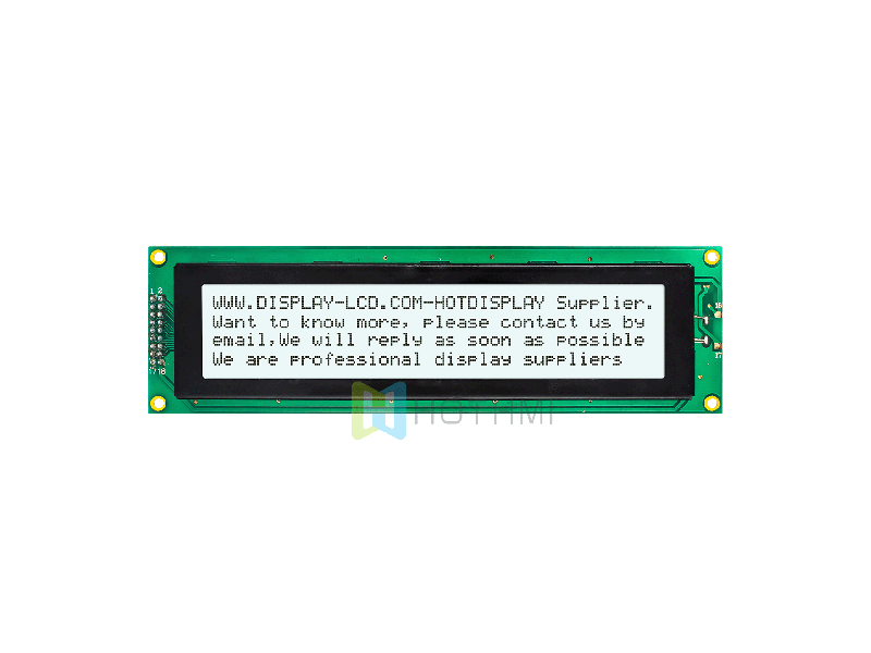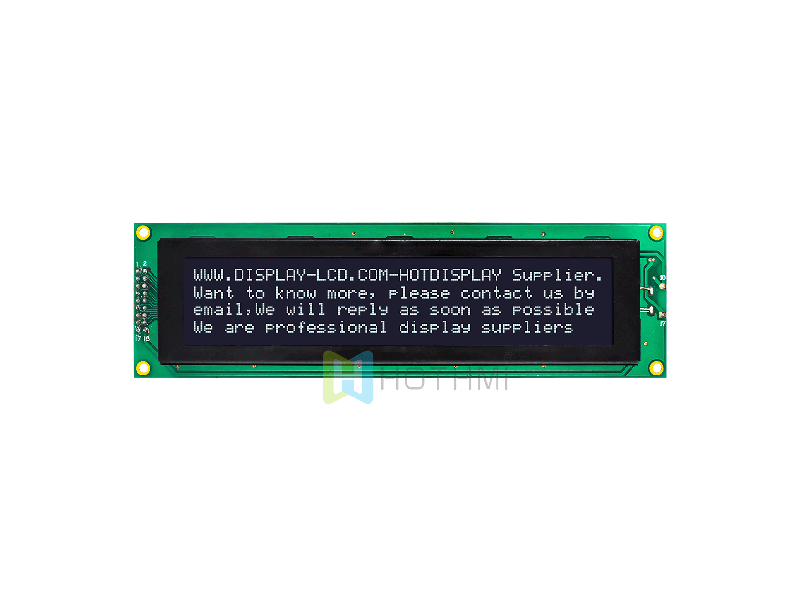 HOTDISPLAY offers a wide range of standard Character LCD modules for customers' application. Our LCD character displays are available from 8x2, 12x2, 16x1, 16x2, 16x4, 20x2, 20x4, 24x2 through to 40x4 formats with 5x8 dot matrix characters. The LCD panel technologies include TN, STN, FSTN, FFSTN types and also with polarizer positive mode and negative mode options. There are different LED backlights are available in various colors including yellow/green, white, red, blue, green, amber, and RGB LEDs as well as no backlight option.