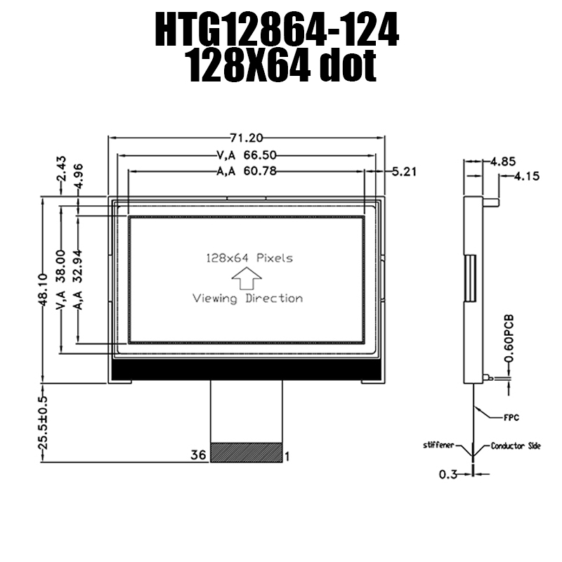 HTG12864-124 | 單色圖形COG | 128x64 點(diǎn) | 透反式液晶顯示器 | 側(cè)面白色背光| FSTN(+)正極顯示